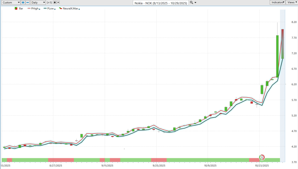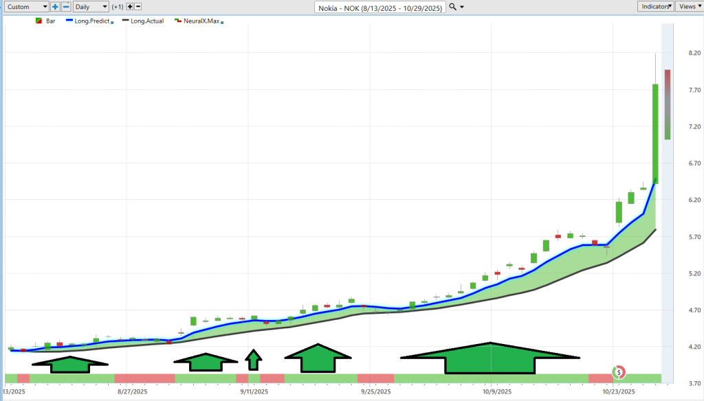 See what happened here. The Neural Index fired green early — quietly, confidently — while the price still looked like a boring telecom chart stuck in neutral. Then the move started. Slow at first. Then faster. Then Nokia turned into a rocket slingshotting past resistance, leaving latecomers racing to chase a trend already in motion.