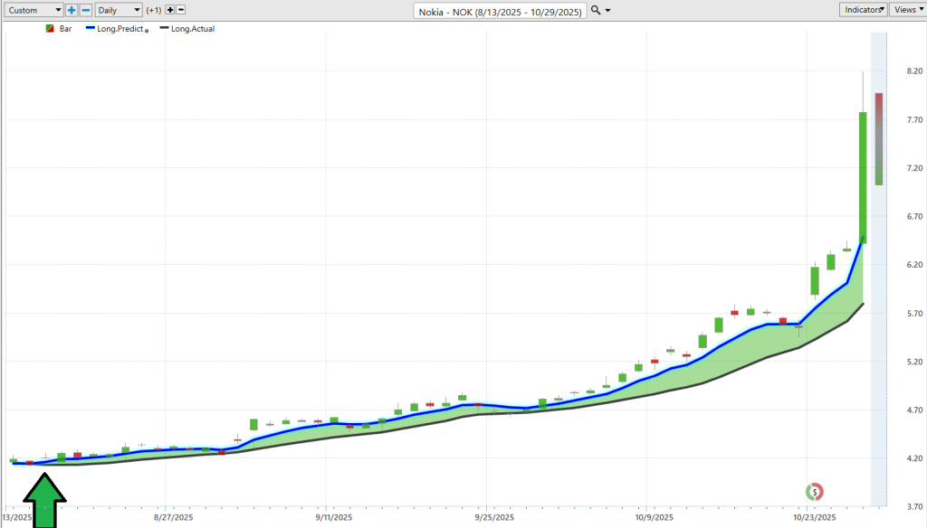 That’s what the chart below puts on full display. From the moment that Blue Line crossed above the long-term baseline — marked by that green arrow — Nokia didn’t just drift higher. It went vertical. A slow climb turned into a sudden acceleration, and then into a breakaway move that most traders only notice when it’s already front-page news. The kind of run that takes analysts from polite curiosity to open astonishment.