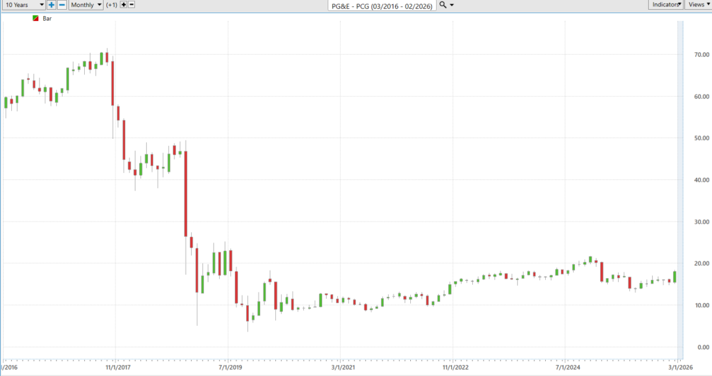The 10-year monthly chart is sobering. Over the last decade, PG&E fell more than 75 percent from its highs. A stock that once traded north of $70 collapsed into the single digits following wildfire liabilities, bankruptcy filings, and massive legal exposure.