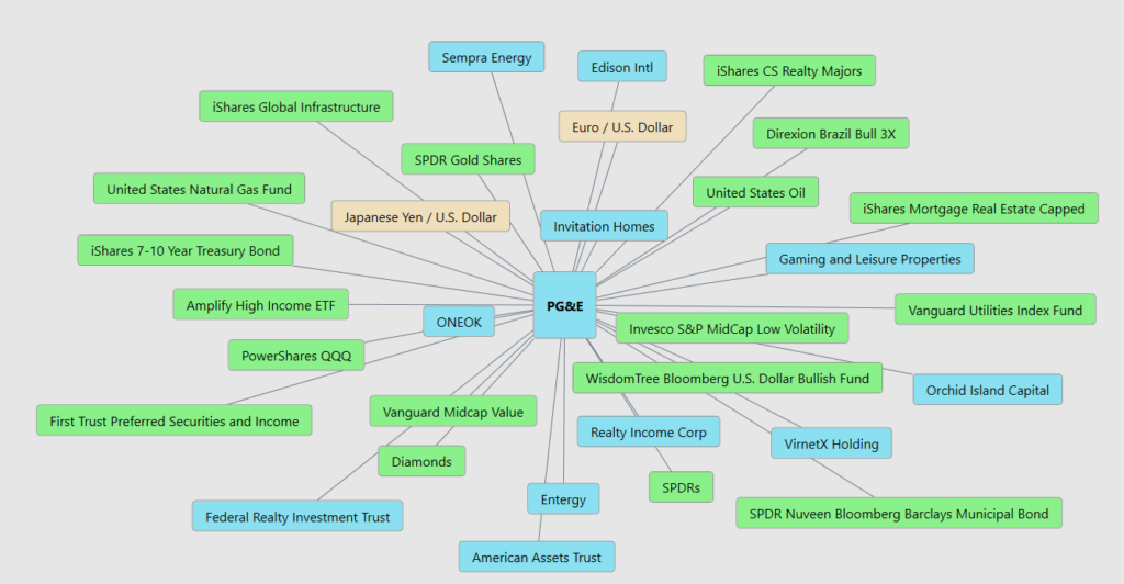 $PCG trades in the same risk bucket as yield assets. When bond yields rise, those instruments compete directly with utilities. When yields fall, money rotates back into income equities. That line from $PCG to Treasuries and muni bonds? That’s your interest-rate sensitivity.