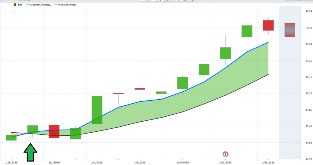 See those red and green projected high and low bands wrapping around price? That is your roadmap. The market is expanding its daily range as momentum builds. The projected highs keep stepping up. The projected lows are climbing right behind them.
