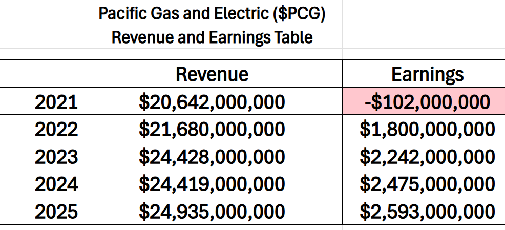 Here is the revenue and earnings table for the last 5 years. You can quickly see that $PCG is a cash machine, and it was devastated by the pandemic in 2021.