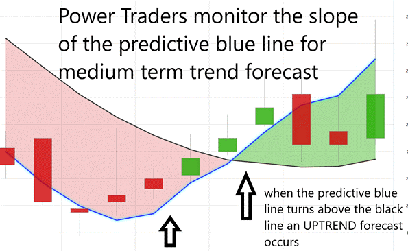 The Predictive Blue Line serves a different purpose. It measures the strength and direction of the intermediate trend. When the Blue Line is above the black moving average and sloping upward, the trend bias is bullish. When it is below and sloping downward, the bias is bearish.