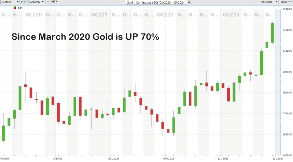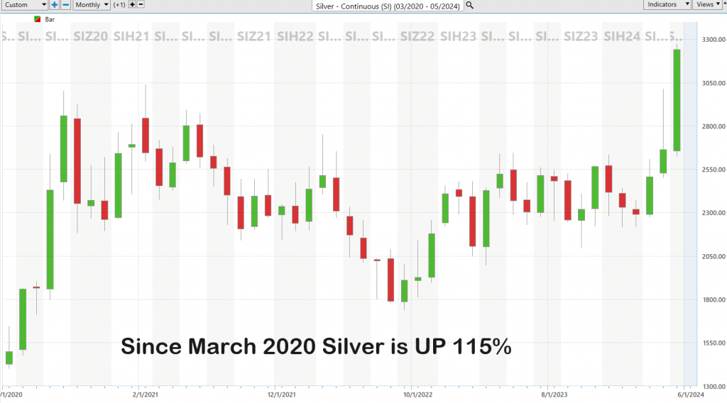 If you question this logic, consider the performance of the U.S. Treasury market compared to precious metals like silver and gold. Since March 2020, U.S. Treasuries have fallen by -21%, while gold and silver have risen by 115% and 70%, respectively.