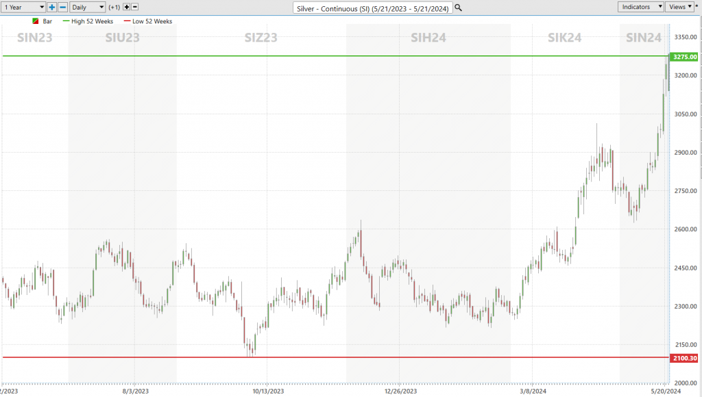 Over the last 52 weeks Silver has traded as high as $32.75 and as low as $21.00