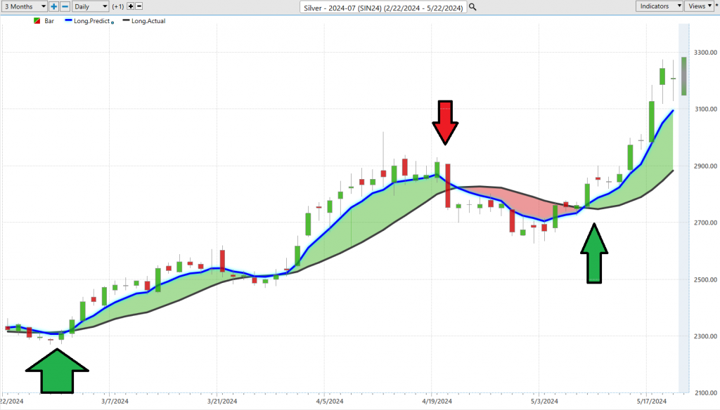 – The trajectory of the predictive blue line dictates the trend forecast and overall trajectory of Silver ($SI).