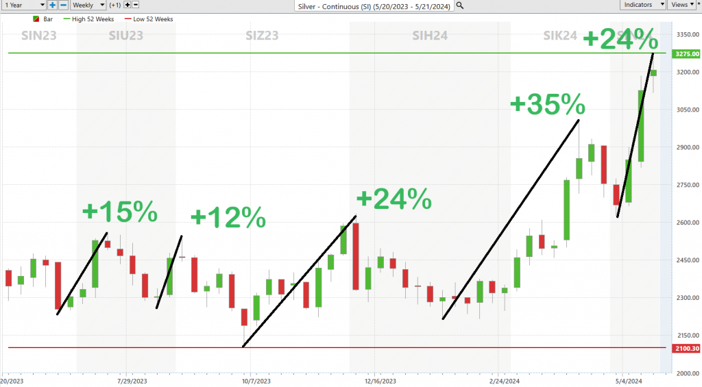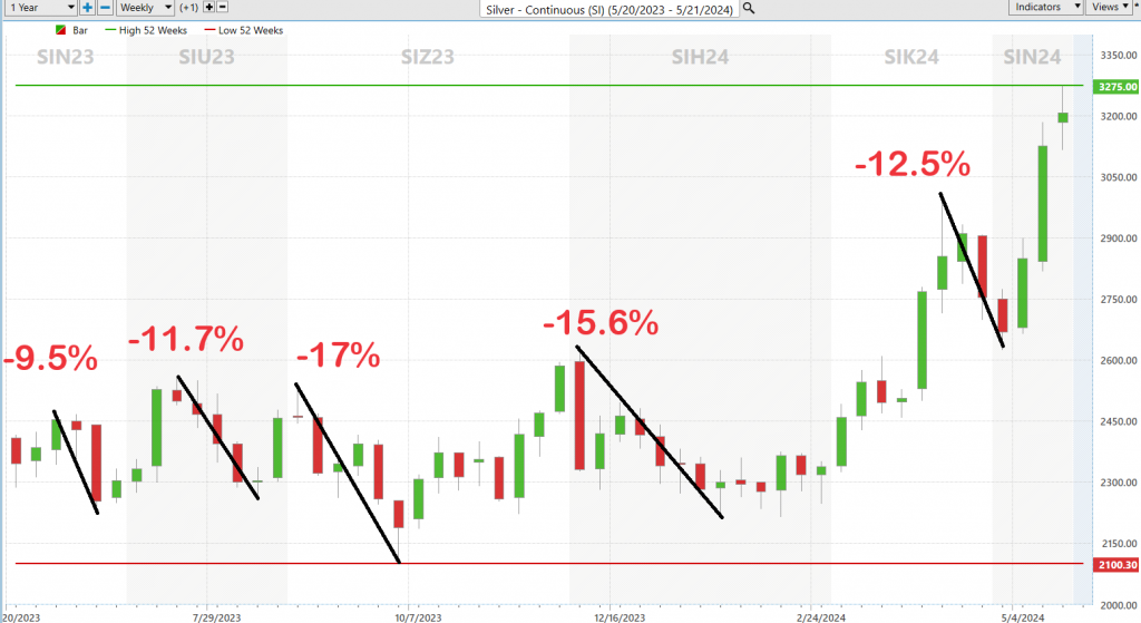Traders aiming for success in the markets must cultivate an objective understanding of risk and reward, a fundamental aspect of savvy trading. A practical approach to this is analyzing Silver ($SI)’s past year’s performance, comparing the scale of its rallies to its declines. Such an exercise not only acquaints one with the typical price actions and volatility of $SI but also is indispensable in forming a realistic view of potential risks.