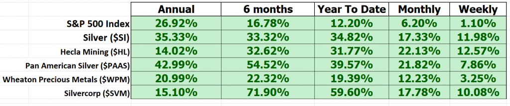 Study these comparison metrics and you will agree that Silver has been a sleeper trend over the past year. It is outperforming the S&P 500 across all time frames. Meanwhile the Silver mining companies are playing catch-up to the metals performance. The Silver miners collectively are underperforming the S&P 500 over the last year but outperforming the broader market across all other time frames.