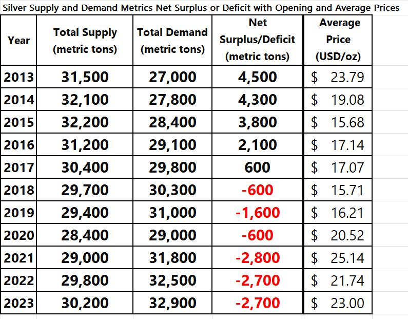 The following table shows the supply and demand fundamentals of Silver for the last decade, along with the average price for each year.