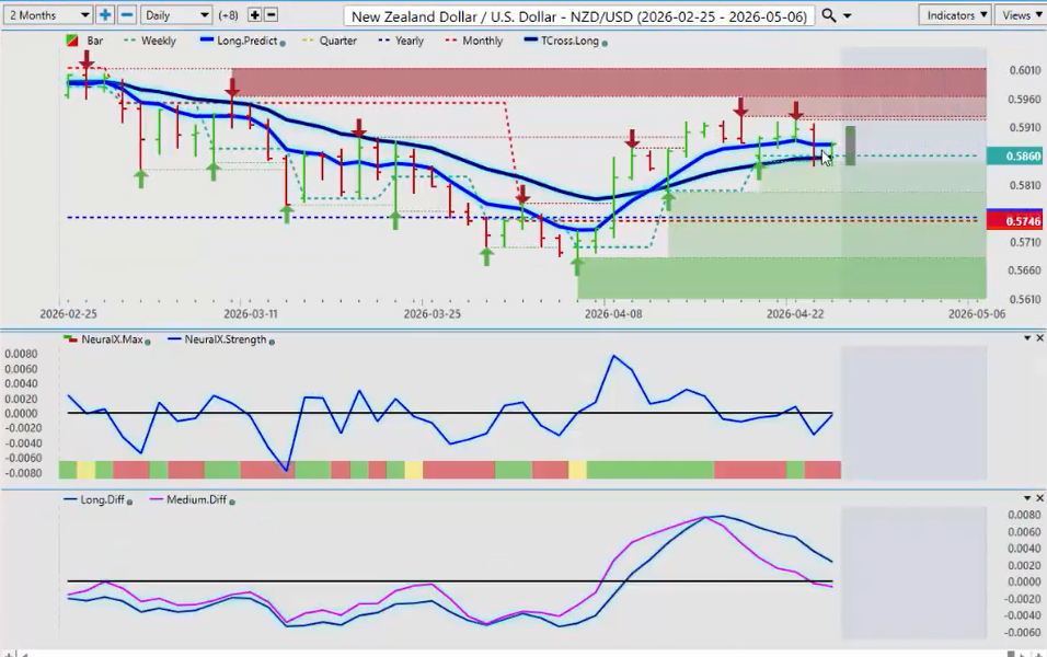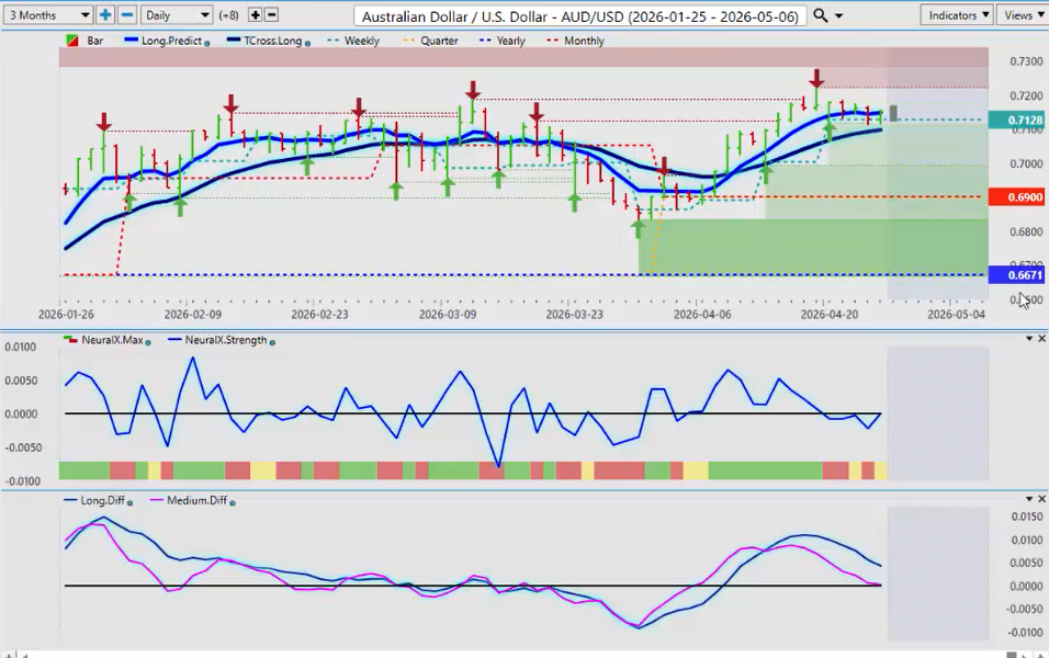 Now, the Aussie and the Kiwi, they remain the stronger currencies in the FX market. Firmly above 6671, the yearly opening price structurally on this particular quarter 69. So this is what I would look for being above the yearly opening price but the quarterly opening for a long trade also above the yearly opening. So once again the neural index very mixed tier. Uh predicted differences trying to show weakness. Uh this pair if we do get any weakness next week we should be using that as a buy opportunity down to our tcross long 7098. But uh I’m it’s not beyond the realm of possibility that we could move towards the 69 area before the dollar uh sells off again and the Aussie continues to move higher.