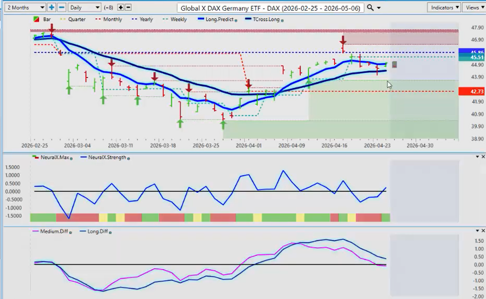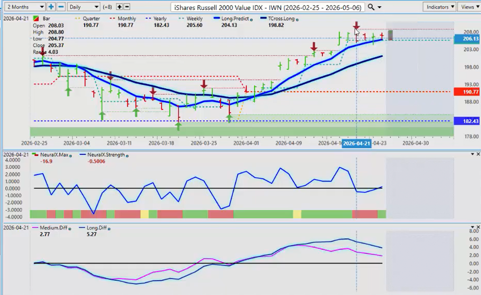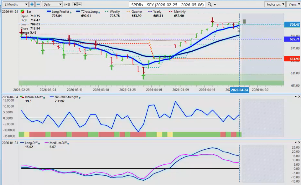 Now, down here, I will be using both the neural index and the neural index strength. Looking at both of these two indicators, the neural index, green means up and red means down. But as you can see, the neural index strength can be out in front of the market by a few days potentially. So again, very important that I’m looking at that.