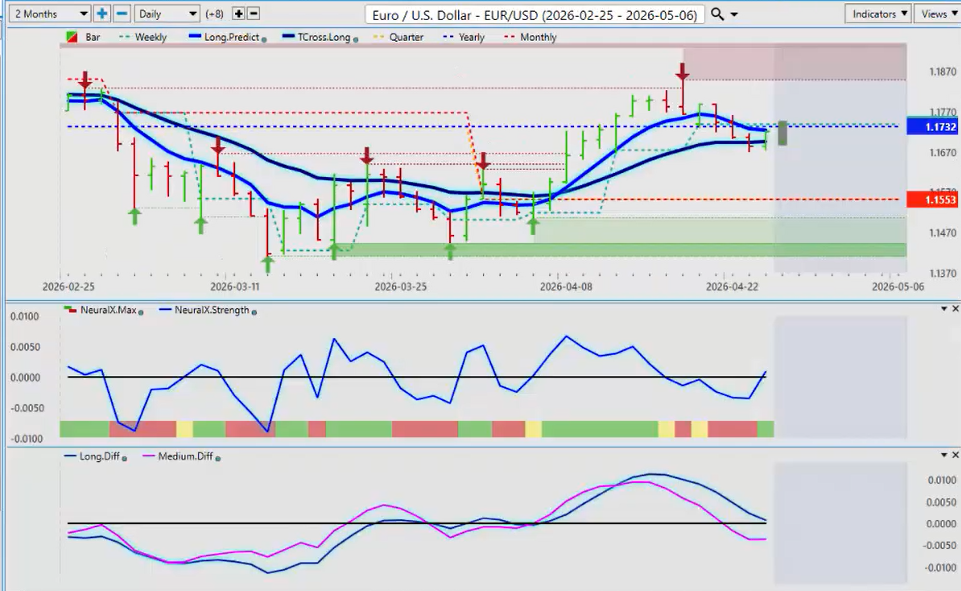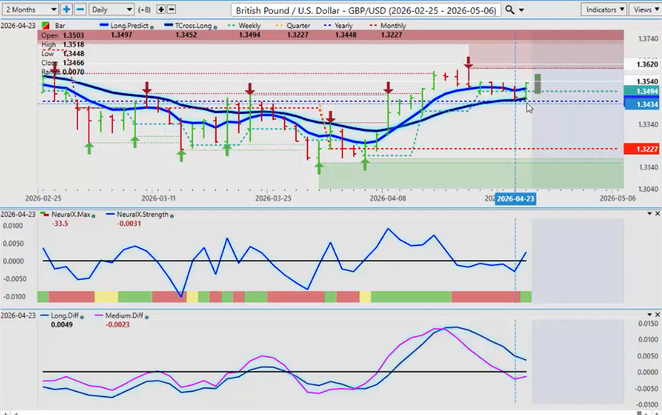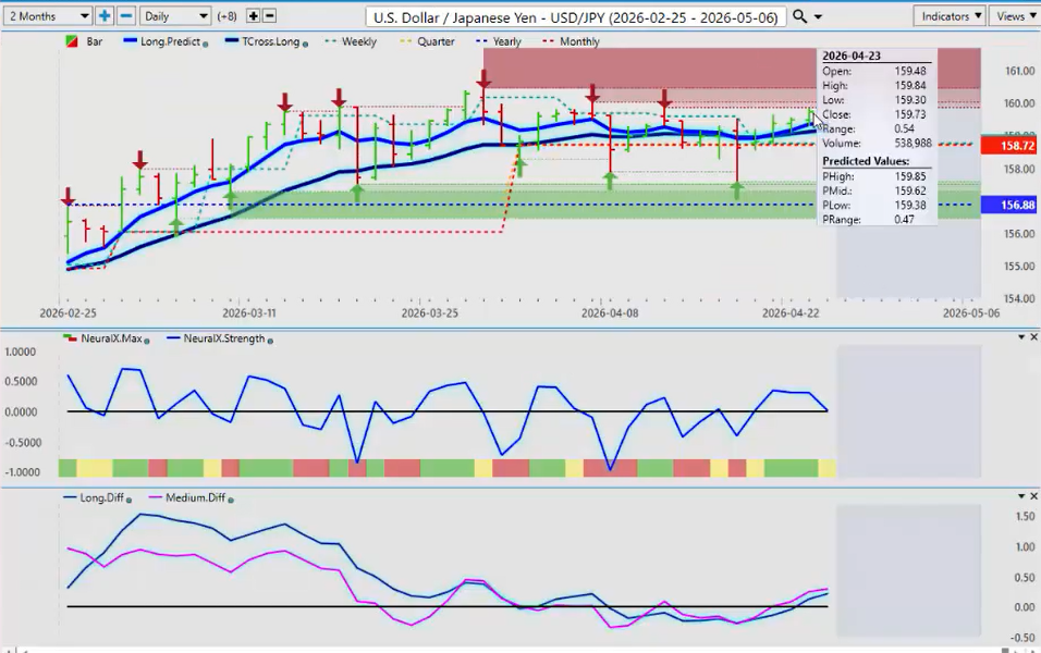 Now the dollar yen once again uh structurally [clears throat] hard to believe we’re sitting up here again in this 159 area but the carry trade is still fully in play. Both of our predicted differences are above the zero zero line. That means we have had a medium-term and a long-term crossover. The neural index, which which is a shorter term indicator, is pointing down. You’re getting a caution yellow. So again, know your levels, guys. And this is how we do it. The trross long 15918, the quarterly opening 15872, and the yearly at 156.88. So, these are our downside support levels that we would buy into at the current time unless the Bank of Japan starts to cut rates and the US uh or starts to raise rates, excuse me, and the US starts to cut rates. So, we’ll monitor it. But for now, going into a period of known dollar strength, longs are favored.