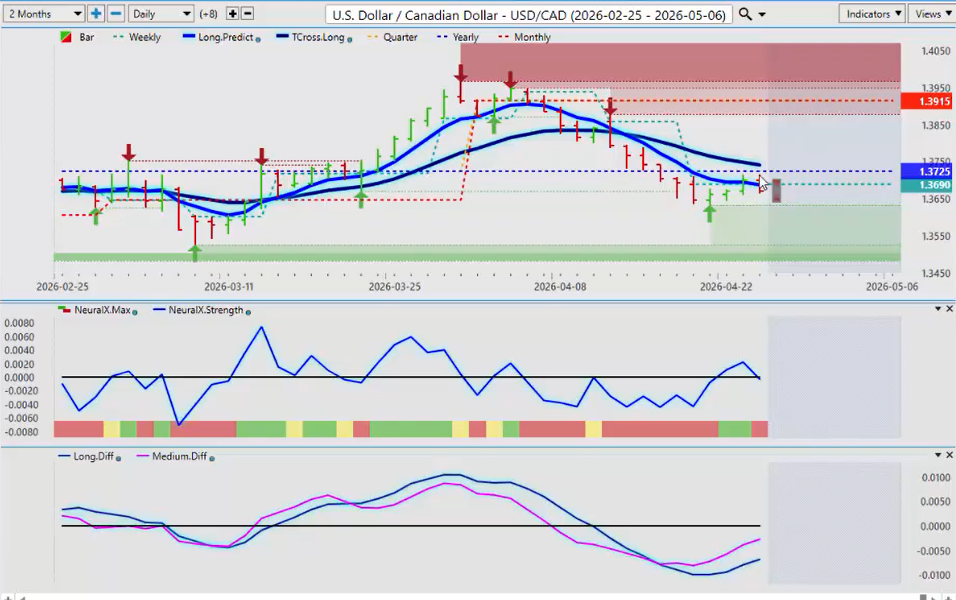 Looking at the US Canadian pair again, we’re slipping just below the yearly opening price, but this one is fairly easy to analyze. We have an MA diff cross back here about a week ago. The market moved a little bit lower, but then you can see it started to reverse back up. So the yearly opening price 137242 25. That’s the line in the sand, guys. If we can hold below that, shorts are still reasonable. But under the the state of the current prime minister and party in Canada, a weaker Canadian dollar in the future is likely once we get past the oil strength. That’s really the only thing keeping the Canadian dollar afloat here. Uh again, so when we look at our upside levels, the yearly opening price 13725 and then our tcross long 13740. So as long as you’re staying below that, then shorts are in play. Another again 13745 a buy stop just above the tross long and if it comes up you can hit it and it will activate a long trade. No recommendation is made being made for longs or shorts. This is for educational purposes, but that’s the way a way to use the VP software.