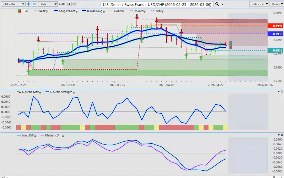 Now US Swiss Franc again the base currency in this particular case where euro US the euro is the base currency here the US dollar against the Swiss Franc there structurally it’s very weak the yearly opening the quarterly opening we’re below both of those you can see the failures up here but uh we do have a medium-term crossover the pink line has crossed over the zero line but the neural index is pointing down so once again if we get a rally up on Monday uh the primary trend 7936. As long as we’re below that, guys, selling up into that level would be a reasonable play. The VP indicators right now are strictly warning of a corrective move higher, not a trend reversal at this particular time. In order to get that trend reversal, we would have to move above 7936 and more importantly move above 794. Okay.
