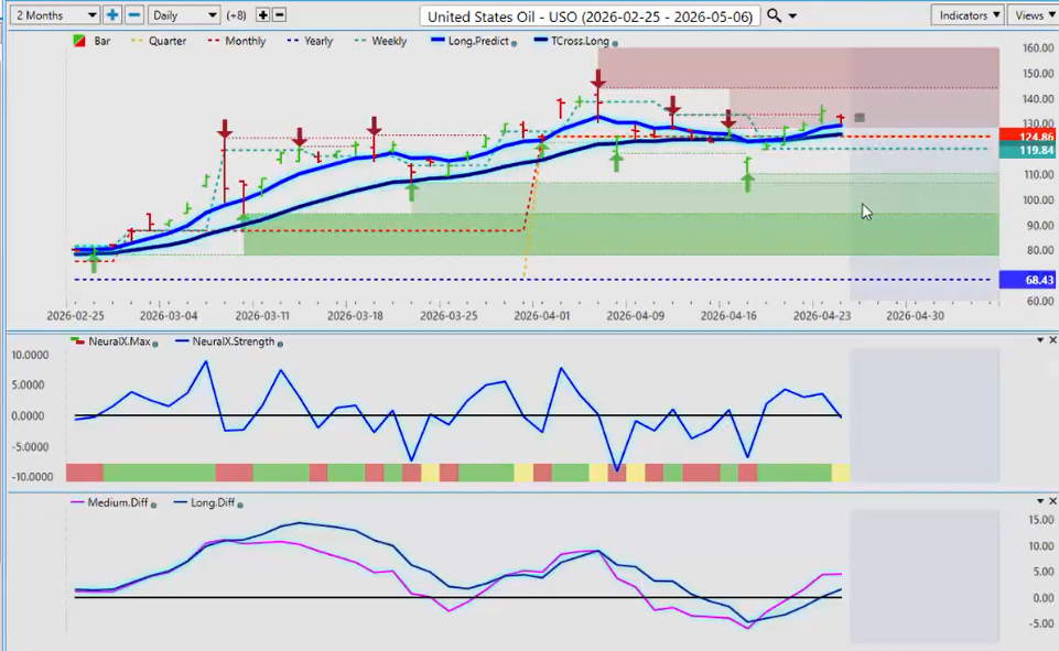 Another way you can play this is put a sell stop below the quarterly opening below 124.86. We break down below that, and then oil starts to tank.