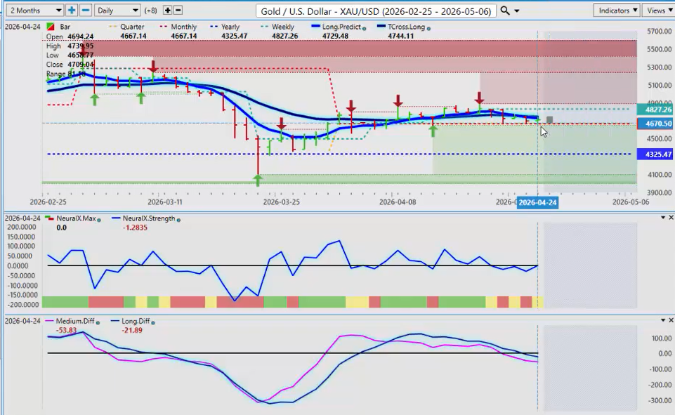 Right now, we’re holding above the yearly opening price and the quarterly opening price, but we are below the TCross long at 4744. I do anticipate some downside pressure on gold this coming week during that period of known dollar strength that occurs on or about a monthly basis.