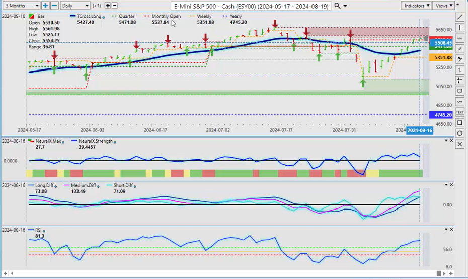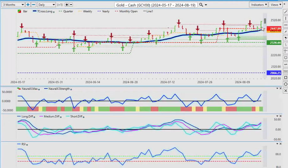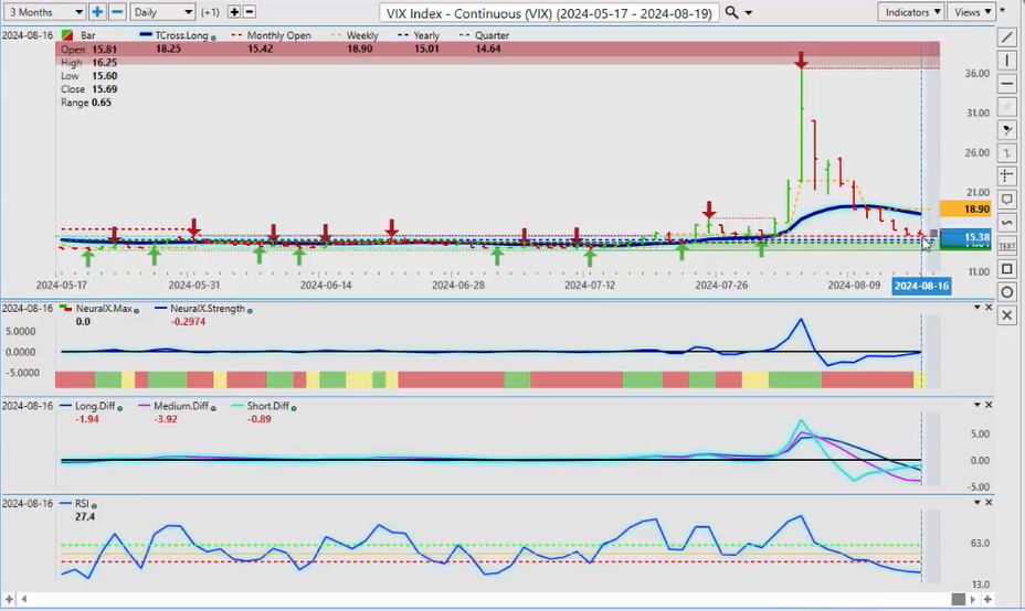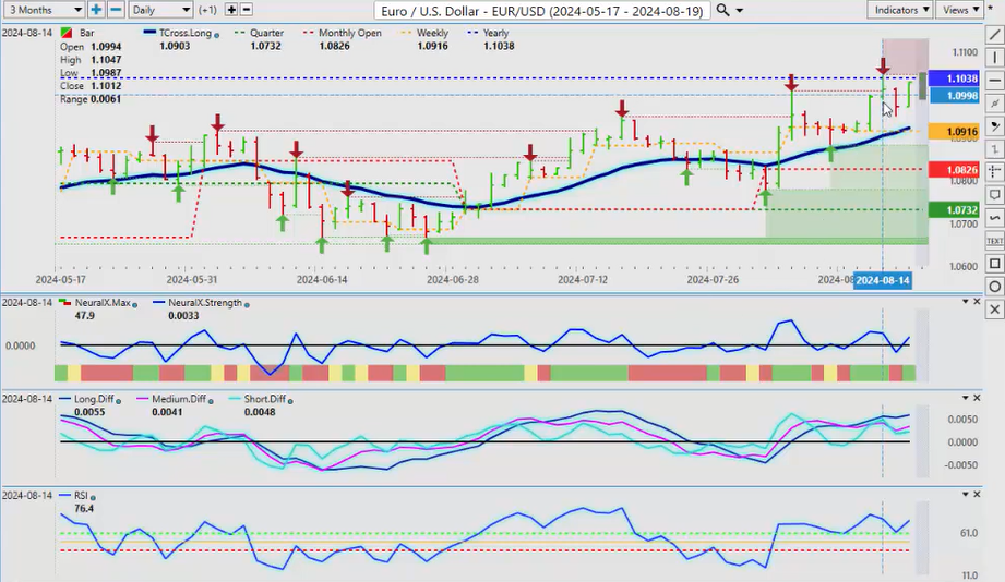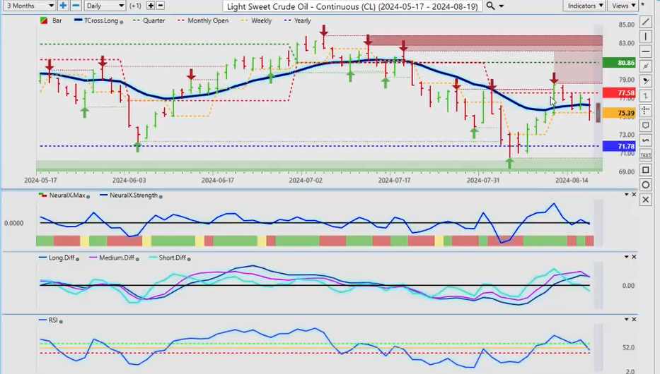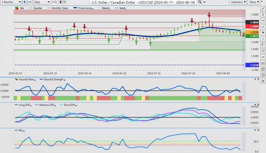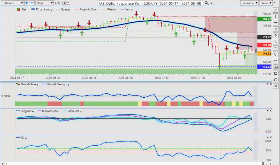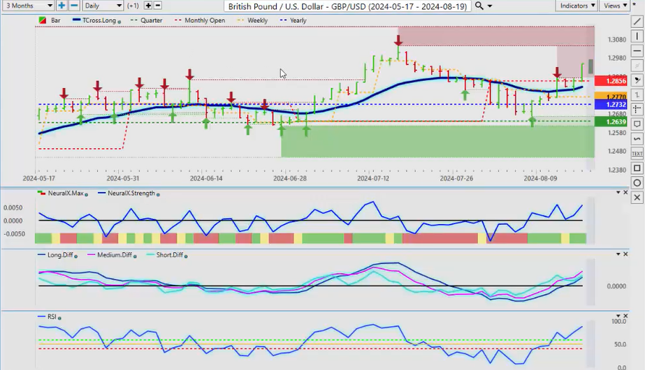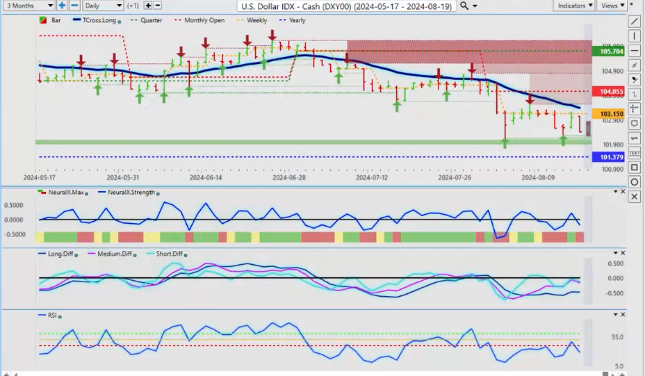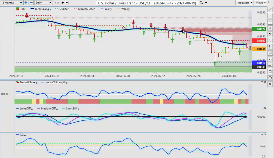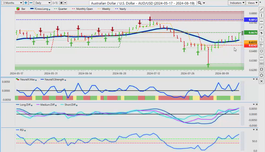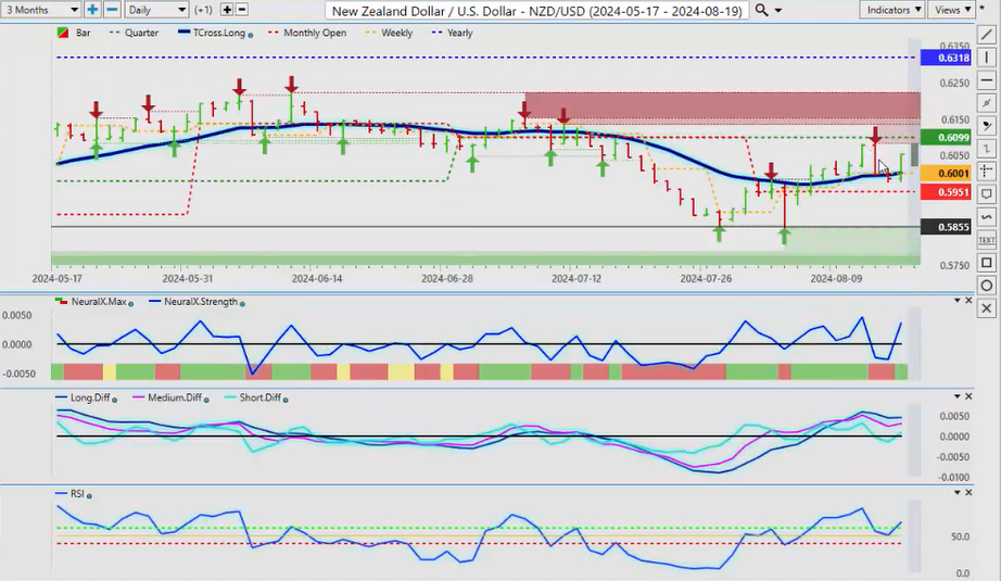 When we look at New Zealand, the same thing here, we’ve already had a failure there. We’ve retraced back down to the T cross long, we’re rallying back up, but the indicators are warning that this is not as strong as what it looks, and that surprise rate cut from New Zealand did have a bit of a shock to the market, uh, so that’s let some steam out of this, and we are going to have the RBA minutes, uh, I believe out this coming week, which will help you know see how some of these Pacific Rim-based currencies are going to do, uh, how the how their banks are looking at things, but I believe they’re next also to cut along with the Fed. So it’ll be a very, very interesting week, uh, a relatively light docket this coming week. We but we do have the Fed speaking a couple of other minor reports. I don’t think there’s anything major this week, but just be careful of what happens on Monday because I’m starting to see a pattern where every Monday they’re making up fake news and they’re releasing it to the market only for it to reverse on Tuesday. Okay, so with that said, this is the VantagePoint AI Market Outlook for the week of August 19th, 2024.