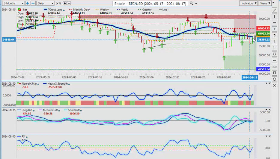 Now, as we look at Bitcoin for next week, once again, not the best month for buying Bitcoin here. We know this, so you can see that we’re struggling, banging into that VP all week. We have struggled to get above the VantagePoint T cross long, that area currently coming in at 60,115.34. So we need to break clear of that, get back up above the quarter. Bitcoin, the Bitcoin seasonal pattern, very good buying between mid to late September and mid to late October, usually the top period for buying Bitcoin in any calendar year. So be patient for that, but for now, we’ve got a large drop down here, uh, on that, I think it was 2 weeks ago, on the Monday, and again, these silly rumors that are being spread around, it’s always on a Monday, guys. So if you hear something that sounds strange, ignore it. Buy the dip, sell the rally because it’s likely fake news is what it is. So be careful, very cautious on that, but that, that news of emergency rate cuts slammed Bitcoin down, but it immediately recovered. So once again, if we get above our T cross long, then Bitcoin—but Bitcoin, to be clear, remains in a firm uptrend. The medium-term trend is down, but the longer-term trend remains up. We just have to clear 60,115. Get back up above the monthly opening price. I could easily see Bitcoin into the 80,000 mark by year-end.