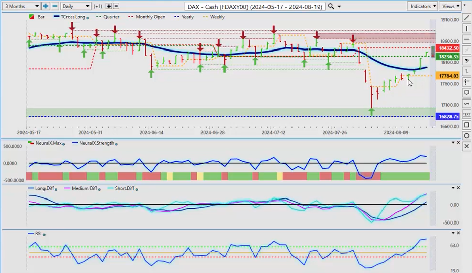 Now, when we look at some of the European equity markets, and of course, the very important VIX to gauge with the direct, to help us gauge with the direction of the equity markets, the VIX is sitting on its current calendar yearly opening price. This is a significant concern for me. If we don’t break below this, then the current rally in equities is a fake move, and that’s how we use inner markets to tell us these things. So if we break down below the yearly opening price again on the VIX, 15.01, then that would tell me the equities are not going to rally in the near term, probably not again until mid to late September, when that dollar buying is concluded at the end of the US fiscal fourth quarter, which is October 1. So once again, be careful of this, but if you’re a stock trader, watch this level on the VIX. Even if you can just Google it throughout the course of the day and see what the price is, but if we break down below that, uh, T cross long, which we’ve already done at 18.25, if we take out the yearly opening price also at 15.01, you’re going to see the equities turn lower very, very quickly, and that would fuel more gold buying and possibly even more Bitcoin buying. So keep an eye on that. The indicators right now are bearish actually on the VIX, so it’ll be very interesting, and how is that going to affect my friends in Europe and Germany with the DAX?