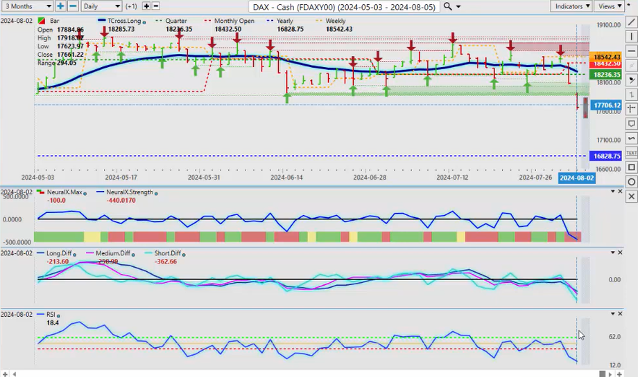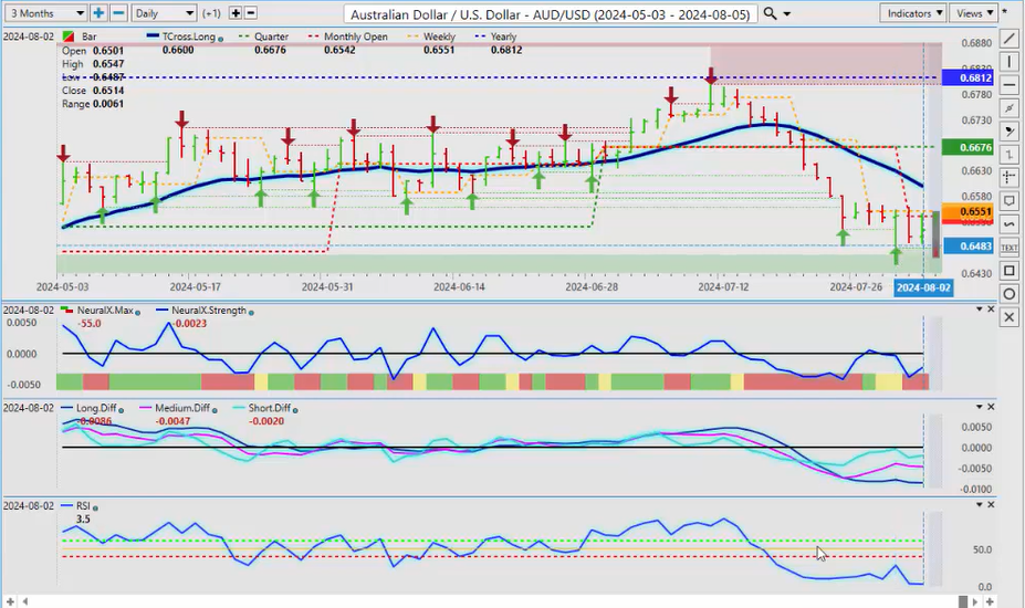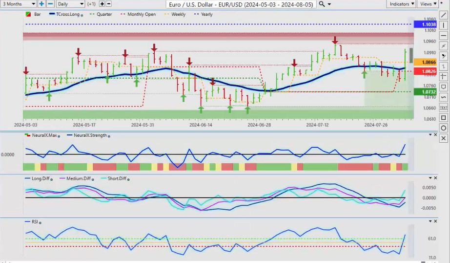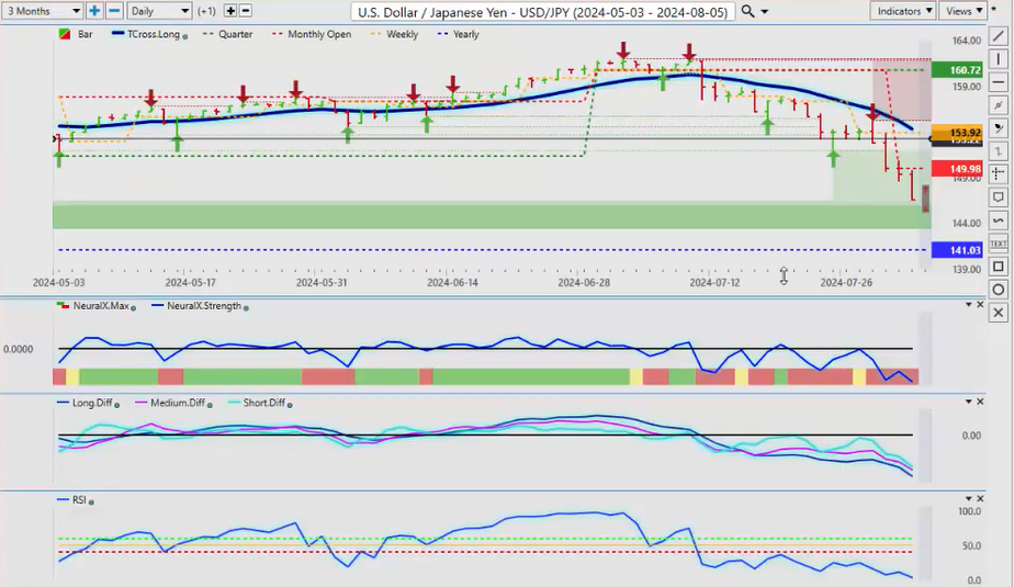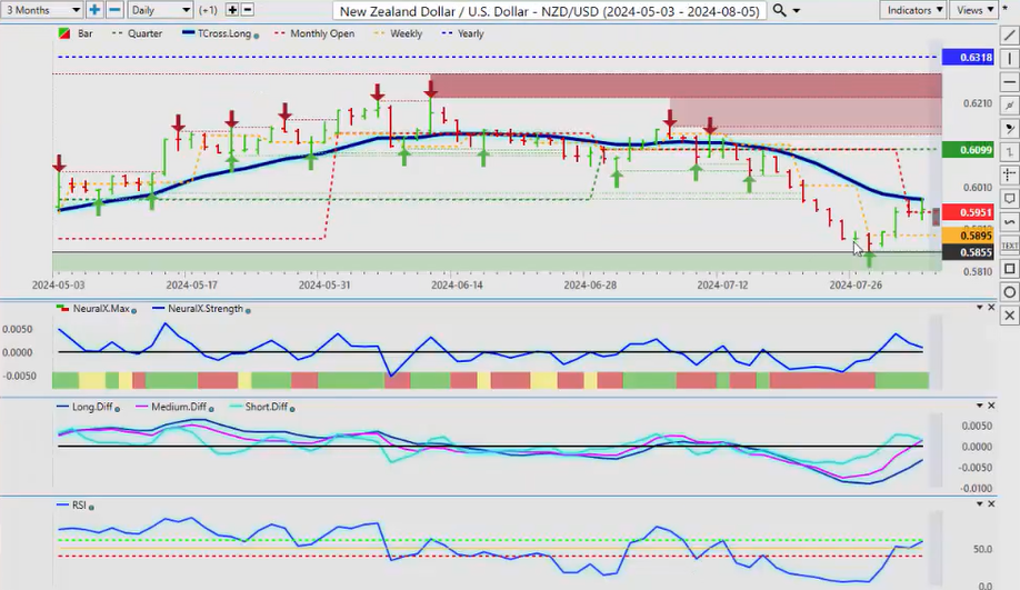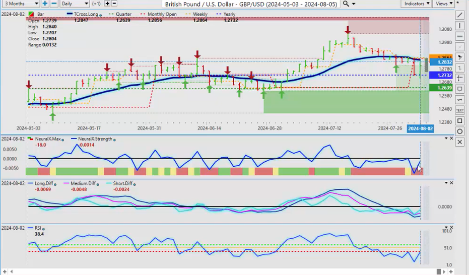 Now, to start this week, we’ll begin with that very important US Dollar Index. As we can see, this previous week we’re running right along the T-cross long, which I had discussed in last week’s Weekly Outlook. We do not look solely at the neural index for a trend. We use our T-cross long with the neural index, with the neural index strength, the predicted differences—there are multiple points of confirmation of a trend. But that’s not determined by the neural index. That’s not a highbrow thing—whatever that meant—that’s too funny, uh, but again, looking at these points of confirmation, these weekly videos are intended to help the average trader utilize the software potentially in a different way, identifying the primary trend and what the short, medium, and long-term trends are. We use that for the predicted differences. So, when we look at the Dollar Index, we can see that we could not get above our T-cross long on Friday. We had a substantial sell-off on the dollar, now that was largely based again on the non-farm payroll number. It was a very, very poor labor report, but my argument would be that that labor report has not been good for months, but the U6 now has had a significant spike from 7.4 to 7.8, plus the unemployment rate went higher. That is now going to likely force the Fed’s hand to cut, but uh, it’s not about one cut, guys, it’s about how many we get into the year-end, and how it will affect the dollar. Now, another point of confirmation in the overall primary trend is the current yearly opening price. We don’t want to look at a rolling performance model, looking at the last random 5 days, the last random 30 days, we need points to do that in the current quarterly opening, the current monthly opening, and the current 2024 yearly opening. So the dollar remains positive on the year while above 101.37, and again, in most cases, there is still dollar strength in the fiscal in the US fiscal fourth quarter, which ends October 1st. So I don’t think the dollar is down and out here completely. I think the market has to digest that labor report, but the immediate pressure currently on the dollar is to the downside. We have three crossover short-term, medium-term, and long-term crossover momentum on the predicted RSI. This will affect all of your forex pairs, guys—Euro/US, Great Britain/US, US/Swiss Franc, US/Japan could be a big one, uh, and of course, AUD/US and New Zealand/US. So, a simplified version of this outlook is that we would either be buying or selling US dollars if the dollar is moving lower—in most cases, your other markets would be moving higher—uh, Gold, Bitcoin, potentially the equity markets, but they have taken a hit because now the market believes the US is going to potentially go into a recession.