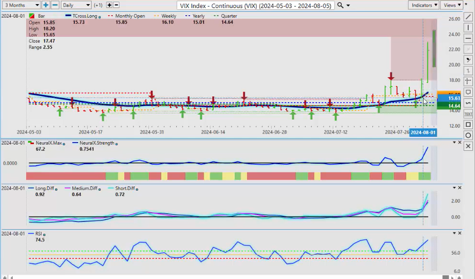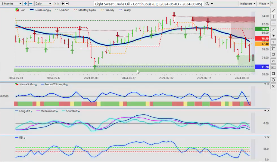 Now when we look at our, uh, Light Sweet Crude Oil, this is in most cases a softer period for oil. We’re approaching the yearly opening price. I would respectfully submit to be careful around this area. Again, we can see that we’ve had a significant rally back in June on this, but at this time of year, in most cases, in the month of August, oil is soft, and Natural Gas is moving higher. I believe it’s almost 100% over the last 5 years, in the month of August, natural gas has moved higher in August. Doesn’t mean it will happen for sure this year, guys, I’m just pointing out a seasonality, a very strong seasonality to keep your eye on. So right now, our yearly opening price on light sweet crude oil—71.78—I do anticipate some buying at that particular level, but again, I need those multiple points of confirmation from Vantage Point to confirm that, and right now, I don’t have that. So when we came down to the yearly opening in June, we had an MA diff cross that started to move higher, we had the break of the 60 level on the predicted RSI, then we broke above our T-cross long. There are multiple levels of confirmation looking for a trade, not just the neural index. That is a short-term indicator, guys. We need to look at the short, medium, and longer-term indicators to get that level of confirmation.