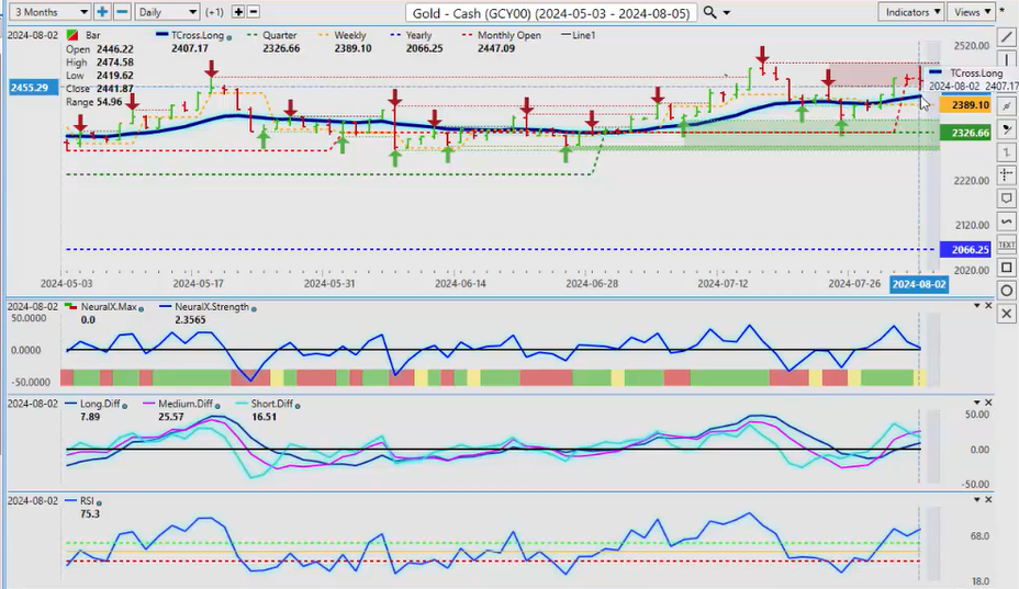 So the dollar remains soft, now this initially saw we saw a spike in Gold. Now, again, gold on the quarter usually doesn’t fare quite as well in the month of August and September, but it does do well between October and January. But right now, uh, I think the bets are building on a potential hard landing, not a soft landing, because the Fed has refused to cut, and while other central banks have already cut twice, uh, I don’t know how many more times he’s going to be behind the curve like this to get out in front of these things. He always seems to be behind, but again, right now, our T-cross long identifiable area—2407—long gold while above this area is reasonable. The indicators are in the other points of confirmation in the Vantage Point software are all in agreement. Now we also have our yearly opening price, gold very positive on the year, uh, maybe even outperforming Bitcoin a little bit this past week. So when we look at this right now, uh, we want to look at our key level, our T-cross long—2407—our predicted differences are rising, and this is the inverse correlation to the Dollar Index: go dollar down, gold higher. So watch this level next week because again, this is an outlook, not a recap of something that already took place. We’re looking into next week’s trading while the market is actually closed on a Saturday.