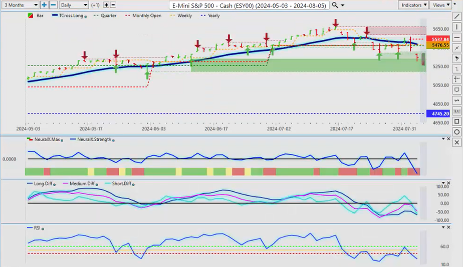 Now when we look at stocks for next week, this is—stocks for next week are going to be very, very tricky here, but I believe ultimately they should start to move higher once we get past the labor report, maybe get a little bit more positive reinforcement the economy is okay, but in most cases, when the Dollar Index drops, stocks rise. So, uh, I believe we could be setting up for a Monday, Tuesday reversal here, uh, which means the market continues to move lower on Monday, and then Tuesday and Wednesday, the stocks start to recover. But again, we need those points of confirmation, and at the current time, we don’t have that. But keep an eye on your neural index and your neural index strength for any kind of trigger point, uh, that would tell us that we potentially could be turning around here, uh, we we have some some verified support lows, uh, the first one is down here at or about the 5191. Now I don’t think we’re going to get to that by Monday or Tuesday, I believe we we will recover prior to that. Remember the current yearly opening price, guys, 4745, the stocks are very, very bullish on the year. Don’t again, we we’ve got to be careful of buying into these short-term reactionary moves. I believe things will settle down again, and they’ll start spinning it, saying that it’s only one bad labor report, well, actually, there’s been multiple bad labor reports, but this is how they spin things, and then, uh, then people slowly start coming back into stocks again.