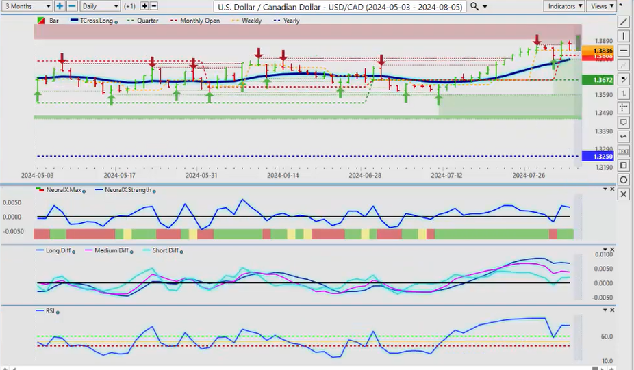 Now, the British Pound/US Dollar is virtually the same trade here, and you can see that it’s not doing anywhere near as well as what the euro is. Bank of England cut this week, another strike against the Fed. What is he waiting for? Uh, again, uh, Bank of Canada’s cut twice, Swiss National Bank twice, ECB once, probably another one coming. Now the Bank of England’s cutting, so the Fed, the longer it waits, the worse it’s going to be for the US dollar, in my respectful opinion. So the pound has a buy signal starting to form, our MA diff cross, neural index strength rising, predicted RSI momentum building, but we’ve got to get above our T-cross long—128.51—once we clear that, the pound is set to move higher. But always remember, there is that seasonal pattern of dollar strength in the month of September, actually usually starts mid-August. So be careful with this particular pair.