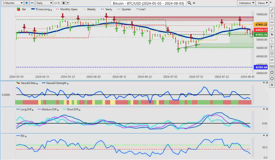 Now, Bitcoin also reacting to that labor, uh, report negatively, but we are still holding above our quarterly opening price—very important, guys, uh, if we lose the quarterly opening price, in my respectful opinion, you still got a buying opportunity as, but we don’t expect Bitcoin to really start making its next move anyway until late September into October 1st, with that very powerful seasonal pattern. So keep an eye on that, uh, area right now. Our quarterly opening—61,633—the indicators are bearish now, but remember, guys, the trend is still firmly up on this on a longer period, uh, so again, uh, it’s all about, well, some people could argue timing, but, uh, I think understanding certain types of seasonal patterns are very, very powerful, and usually before they kick in, they flush the market out first, so they’re probably going to run some stops on Bitcoin, but you’re still looking at a buying opportunity, uh, in my respectful opinion only.