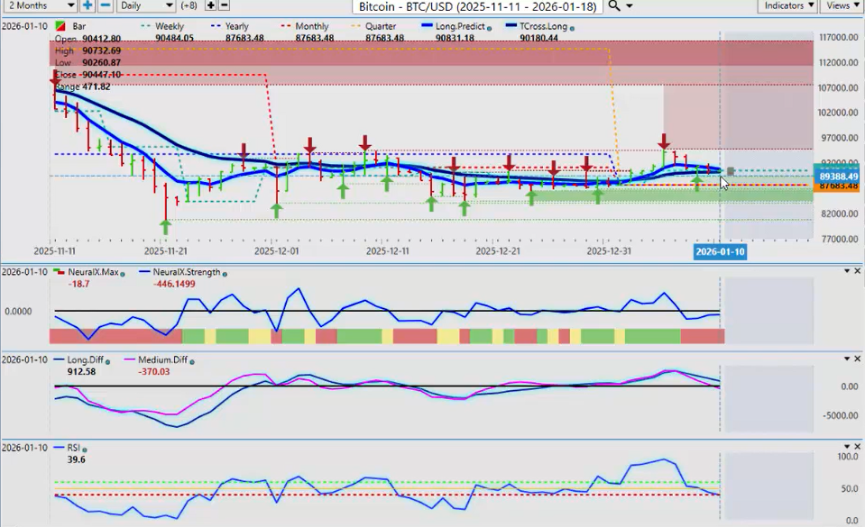 We need to stay above that level if we’re going to continue to buy Bitcoin. Now, a little bit of a concern—the medium-term crossover has occurred. But always remember, guys, we only use the medium-term crossover and validate that once if we break down below the T-Cross long. That area is at 90,180.