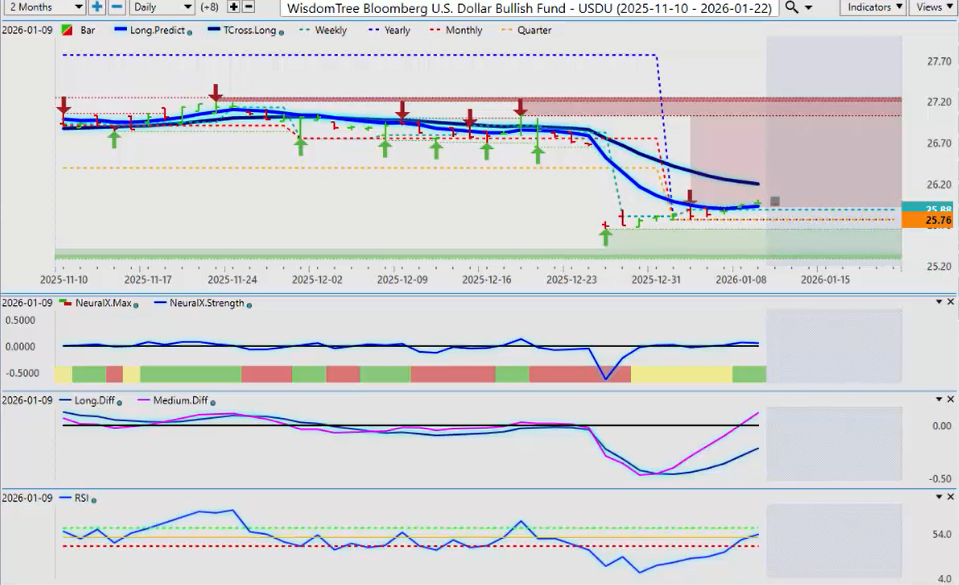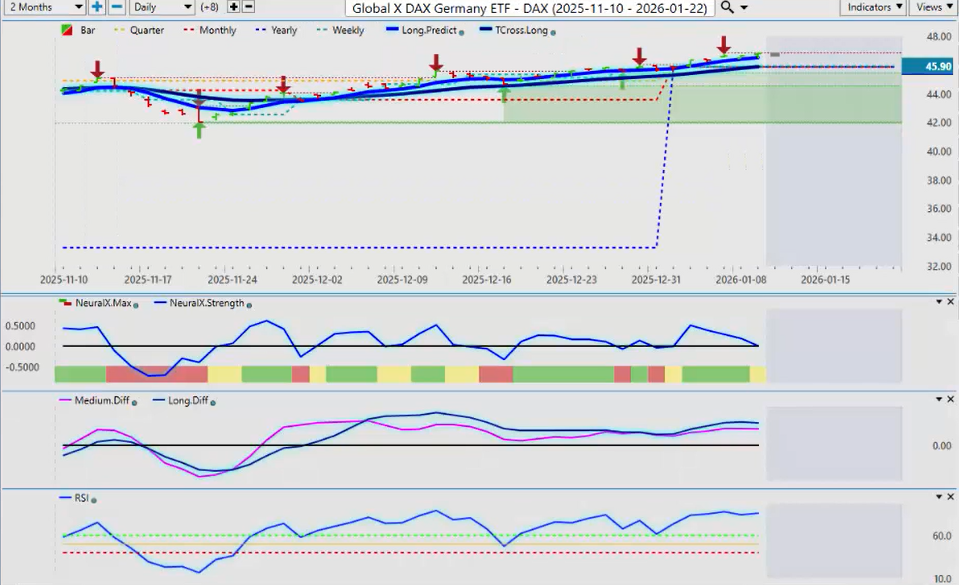 A little bit of a concern with the neural index strength indicator pointing down, but for now, it still looks pretty decent for longs. Regardless of whether you’re in DAX Futures or the DAX ETF, this ETF has been very accurate as of late.
