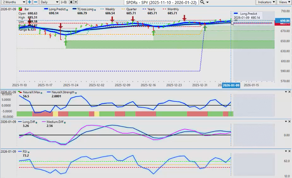 But looking at the SPY, we’re well supported on the yearly opening price. That’s at 685.71—quarterly and monthly, obviously the same price this year. Now, our predicted differences are holding above the zero line. The predicted RSI still is warning us of upward momentum.