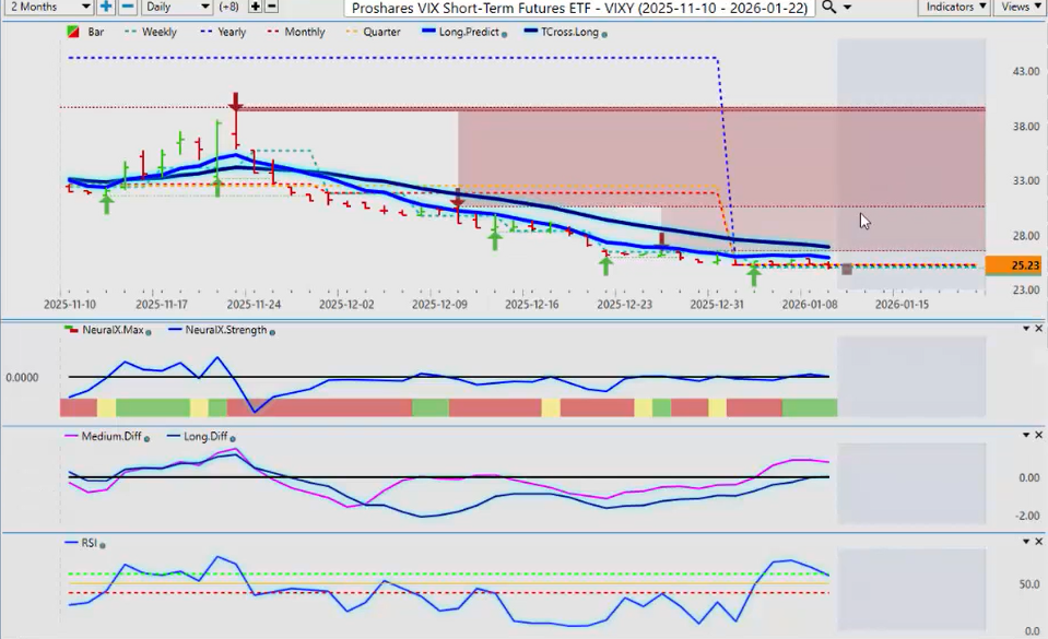 Now, a quick look at the VIX market to see what it’s doing. And again, the VIX is sitting right at the breakout point to the downside—the yearly opening price at 25.23. Our T-Cross long additional resistance is 26.92.