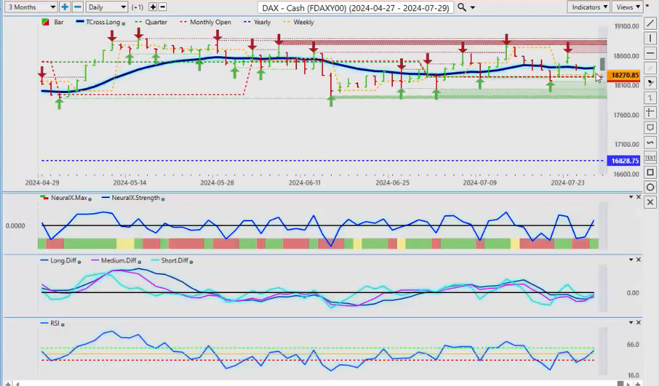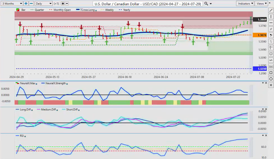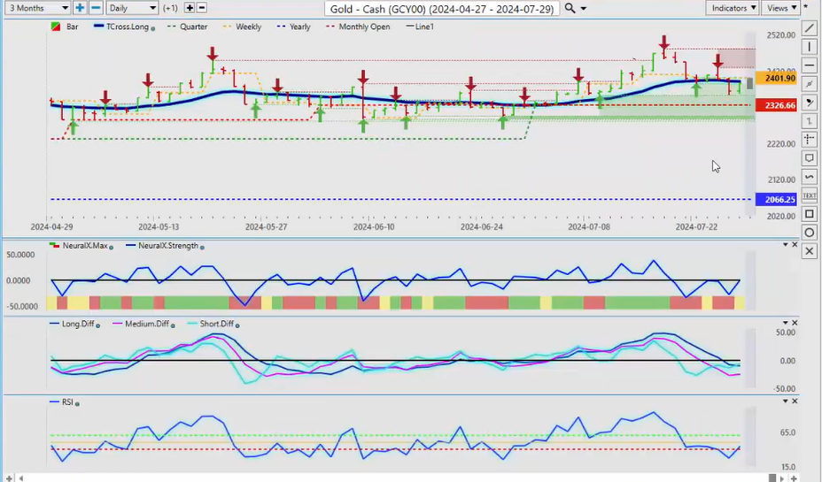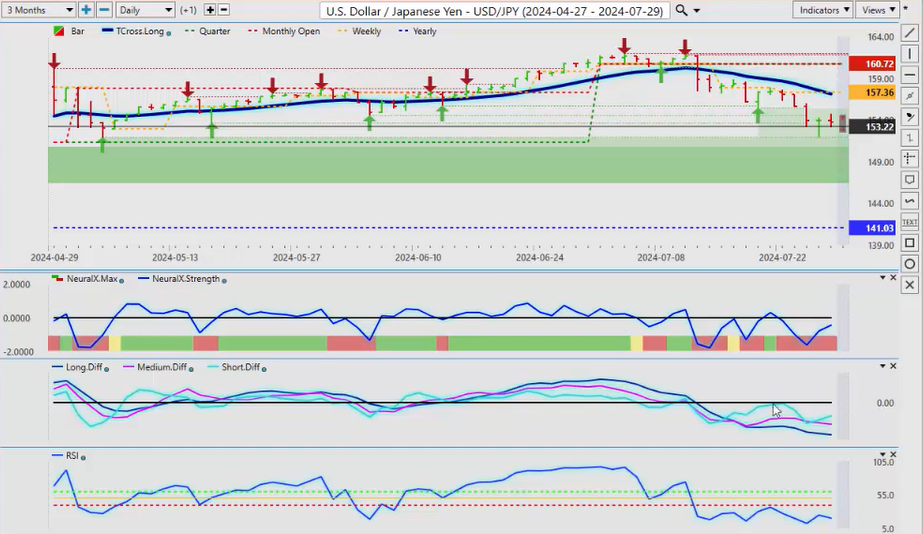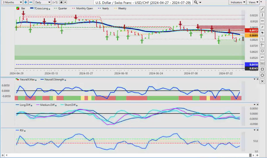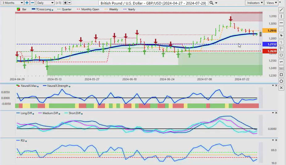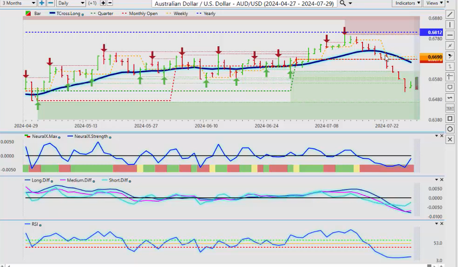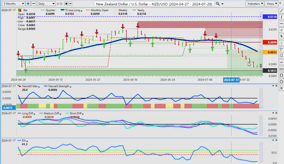 The Kiwi, same deal, guys. You can see that selloff, and now we’re starting to see the predicted differences rise. The predicted RSI, as you can see here, is extremely low, and this is why we don’t use overbought/oversold methodologies; we, we look for momentum with a break of the 40 level on the predicted RSI, that that is, and below the T-cross long. But you can see, we still have day-positive days with a green neural index, and we actually for one day did move higher, but then it immediately turned back to red. But the core thing that you want to remember here always measure the market, whether it’s above or below the T-cross long, to help filter out false signals and identify the primary trend. In this case, with Kiwi, we’re below the yearly, we’re below the quarterly, and the monthly, and we stayed below the weekly opening the entire week, guys. So that’s what we’re looking for in identifying using multiple predictive indicators. So, with that said, this is the Vantage Point AI Market Outlook for the week of July the 29th, 2024.