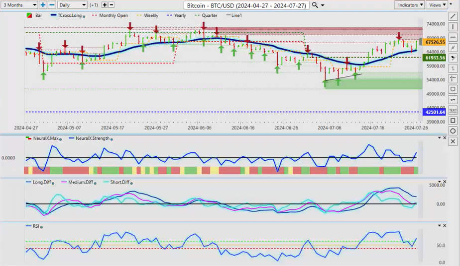 Now, when we look at the, uh, main Bitcoin Contracts again, uh, the one thing we really have to do, guys, with Bitcoin is just ignore the media. They’re, they seem to be ADD or something. I don’t know what it is, guys, but they just, they’re constantly negative on Bitcoin. Bitcoin has had a phenomenal year last year, up 155%; it’s done very well again this year, and we are likely going to extend higher, but that probably won’t be until mid-October. But for now, we are holding above our T-cross long, 64,0439 is the main, uh, line in the sand. But once again, when we look at these corrective moves down here, when the neural index goes red, then that’s a higher risk trade because we’re above the T-cross long. And always remember, guys, this is an outlook, not a recap of something that’s already happened. So I give these levels each week, but it’s very important to use our inner market correlations and to further use or combine the core Vantage Point indicators. We do not only just look at the neural index or one indicator; we always combine as many of the predicted indicators as we can to get a bias, but the core for me is the T-cross long. So you can see Bitcoin retraced to that on Thursday and then rallied off the same level on Friday. So right now, Bitcoin is looking pretty good; we’re above our quarterly opening price here at 61,933, but the T-cross long, that’s also a big area to keep your eye on going into next week’s trading.