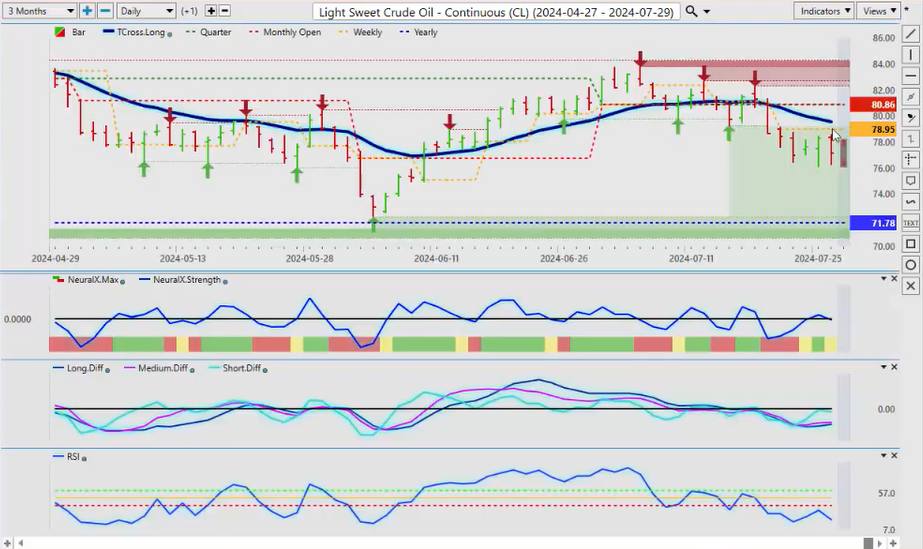 Now when we look at Light Sweet Crude going into next week, still under pressure here. The normal seasonal pattern would be oil down into August and Natural Gas starting to move higher, uh, but right now we do have that Ma diff cross, but this would be a corrective move higher guys, back to our T-cross long, that’s at 79.54. Now, we can further assess using that current quarterly opening price that Oil has been bearish this for about the last few weeks, or I would argue the better part of the start of the third quarter on July 1st. But there was some buying up here, and then we started to lose that level of the quarterly opening. We broke down below the T-cross long, and at that time, the neural index remained negative for multiple days. Now, if you have a green neural index, that just means we’re correcting higher on that particular day or maybe a day or two out, but it doesn’t, it is not a trend-defining indicator, so to speak. The T-cross long is, or quarterly opening, are yearly opening, the additional Ma diff cross. All of these additional tools need to be factored in because, again, the way the way we want to make sure we’re looking at that is what is the the the current trend in Oil. We look at the seasonal pattern; usually, Oil starts to get softer the closer we get to August and September. So right now, uh, a corrective move to 79.54 is reasonable.