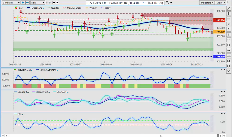 Now, to get started this week, we’ll begin where we always do with that very important US Dollar Index. Now, what we can assess here is the Dollar Index holding below its current quarterly opening price, which I’ve discussed since July 1st, at 105.70. Our T-cross long, which is our main level to determine what is bullish and what is bearish, is not determined by the neural index or some of the other indicators we use. Our core—quarterly, weekly, monthly, and yearly opening price—now the Dollar is still above its yearly opening price, but as you can see, we’ve been very negative in the first part of the quarter, so again, of the third quarter, excuse me. But always remember, this is the fiscal fourth quarter for the US. Usually, the Dollar is strong in the month of September and then we move into that strong seasonal pattern of weakness from mid to late September into early January. But the indicators right now, uh, the move higher this past week, we’ve hit into that T-cross long, our main defining point in the software. We failed; the indicators are warning that we’ve got downside coming again. The predicted RSI basically showing we have momentum building. Now a very heavy, uh, fundamental trading week coming up. We’ve got the Fed—all eyes are going to be on the Fed. Uh, it’s very unlikely that he’s going to cut in July, but I’m pretty sure he’s going to signal multiple cuts are coming following the Bank of Canada, the ECB, and some of the Swiss Bank. Again, following that same, uh, pattern of the other central banks. So right now, I would respectfully submit the Dollar is likely to come under some pressure during that Fed meeting, uh, later this week.