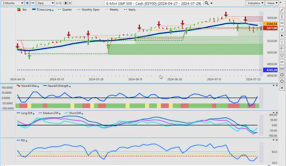 Now, the neural index is a very short-term indicator, one to three days tops at best. I use it as a daily, uh, tool actually, and as you can see as the market fell on the equity markets, the Ma diff cross took place over here. Now we’ve crossed over the quarterly opening, but we’re not staying below it. So once again, the same thing that warned us of this weakness in the equity market is now pointing towards some strength. The pink line crossing over the blue line or the the Ma diff cross is a classic reversal tool, but again, the neural index, in my respectful opinion, only should be used more specifically with the T-cross long so you always know that way you’ll always know where you are in the current trend. We’re under the T-cross long, uh, so this past week V Point had has not forecasted a strong stock market this past week, but next week is starting to look better if that Ma diff cross can complete, but we must get above the T-cross long at 5517 for any long trade to actually work in this particular setup.