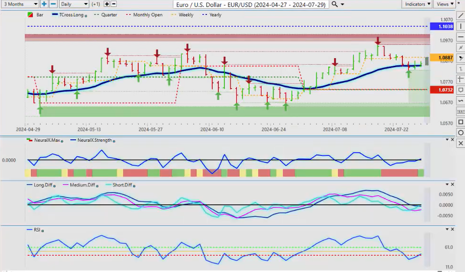 Now, when we look at some of our main *Forex* pairs again, we could have a decent week coming up here, with some Dollar selling. It all depends on what we get, uh, what the outlook for the Fed is going to be. So the main, the first thing we want to look at would be the Euro-US pair because that is the highest inverse correlation to the Dollar Index. So right now, you can see that the Euro is slowly starting to rebound. So our T-cross long 108.49, the indicators in VP are slowly grinding higher, the neural index strength. But remember, guys, that’s a short-term indicator; we must combine that neural index with a longer-term predicted moving average, or even a medium-term predicted moving average like the T cross long. So if we click on the f8, you can see that every single day it’s banging into this level. So if we can break above 108.63, the Euro could continue its advance towards the 110.38 area. And some, but not all, of the predicted indicators are in agreement on that.