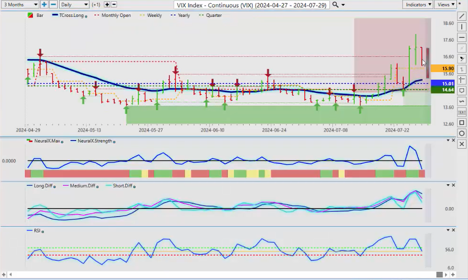 We want to make sure we’re looking at the Vix, because I talked about the, the Vix, excuse me, several weeks ago and warned that if we break above that yearly opening price, then the equity markets are going to have a problem. And that’s right at the time that we got the Ma diff cross on the S&P 500 around July the 16th. So I just wanted to clarify that point, that, Vantage point was actually forecasting stocks to go lower over the last, uh, I would argue, over the last week and a half, almost two weeks. But for now, the Vix has a very clear sell signal. The Ma diff cross, the medium-term diff over the long-term diff, is warning us that the Vix is getting ready to drop. So again, this being an outlook, not a recap of something that’s already taken place, we can prepare for that. The volatility will be the non-farm payroll number and, of course, the **Fed**, which will be coming on Wednesday.
