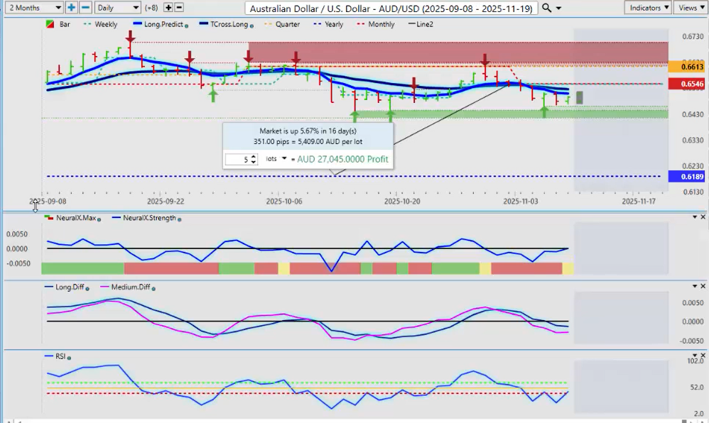 So for now, that is our low. We’re correcting higher. The VP Neural Index strength is pointing higher. Reverse check mark on the predicted RSI. We may have a long trade coming here next week, but I would like to see us get above the quarterly opening price at 0.6613, but the very minimum I will accept is to get above the monthly opening price at 0.6546.