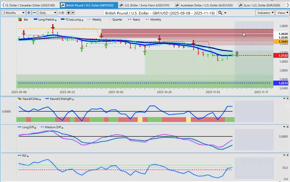 Now when we look at the euro, once again the euro started to turn here at basically near the end of the week. We had an MA Diff Cross. What I would like to see with the predicted RSI is a sustained break of the 60 level. I do have an MA Diff Cross that looks quite good here. But again, that’s corrective in nature until such time that I can break through 1.1579.