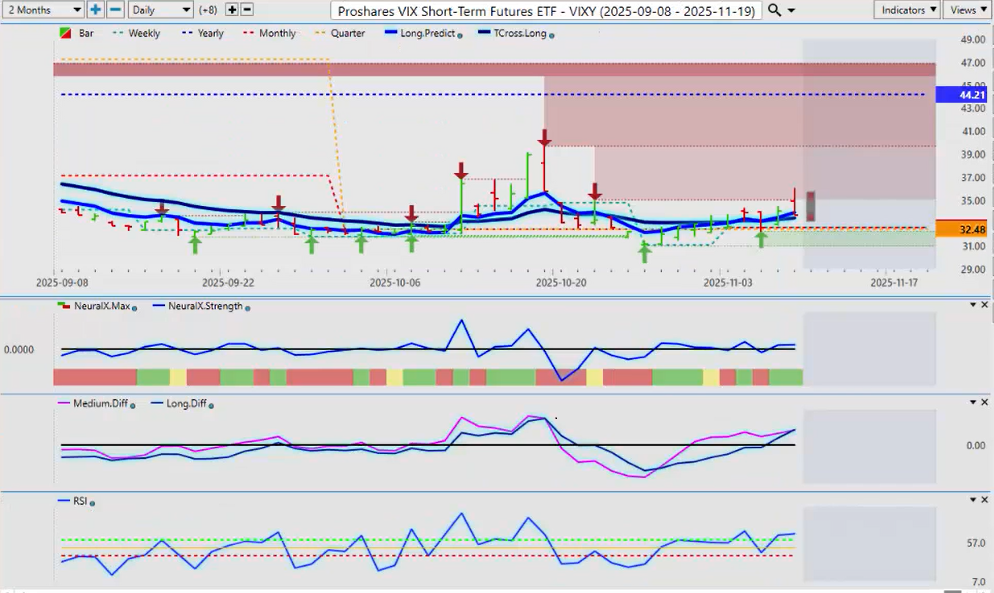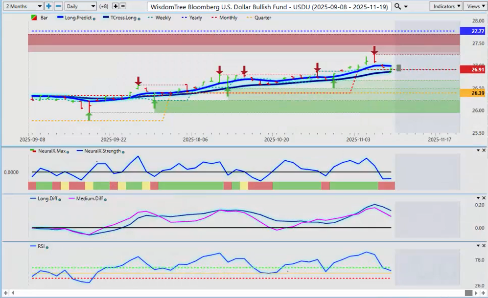 My name is Greg Firman and this is the Vantage Point AI market outlook for the week of November the 10th, 2025. Now, to get started this week, we’ll begin where we always do, with that very, very important US dollar ETF fund. The USDU is the one I’m going to be using this week. Now, the dollar is under pressure here to end the week. We started failing up here on Wednesday. We’ve come back, a full retracement, to the Vantage Point T-Cross Long, that area coming in at 26.86. That’s the level that needs to hold.