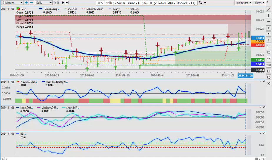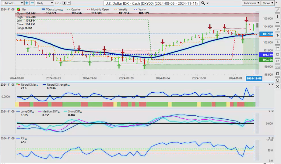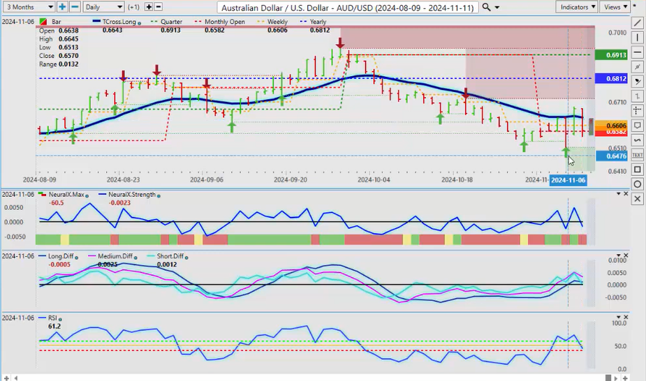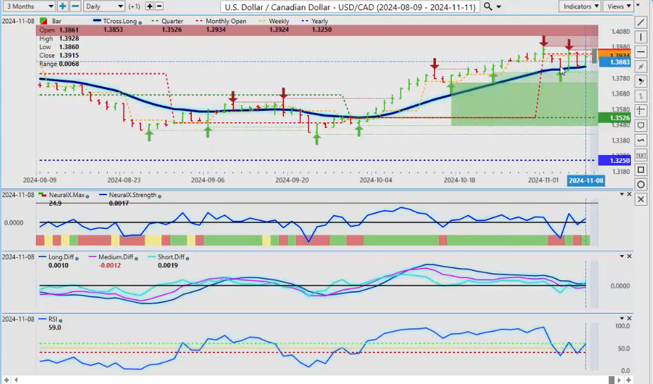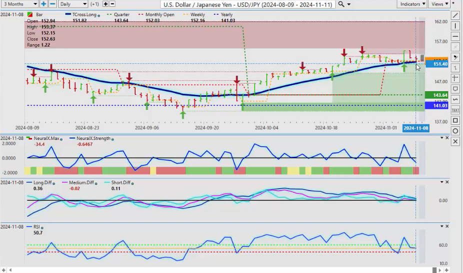 Now, the Pound Dollar, guys, I’m going to do it again. We’re going to look at that election bar and say, ‘Okay, the high is 1.384, or the low is 1.2835. I need a break of this area, and until I get it, I can play both sides of this particular bar. We’re above our yearly opening price. This pair is different than the Euro-US. It is still positive on the year, where the Euro is not. The Euro has never been positive on the year for any significant length of time, but the Pound has. So again, we’ll monitor this one very closely, but the indicators on this one are moderately bearish, but the neural index, the neural index strength, we’ve got a yellow, which is cautionary. And again, it’s trying to find its way here, but I believe it’s going to take a few more days, maybe a week and a half, before we really get a feel whether that dollar is going to hold its gains. And the data next week, with the CPI data that I believe the FED speaks again next week, these will all factor in, to what we’re doing because let’s face it, there’s going to be some volatility here because I believe that Trump has also said Powell’s history, but I also don’t believe he has the power to fire him. So, I’m Canadian, not US. I’ll see where this thing goes, but for now, I don’t think Powell is going anywhere. So if that’s the case, then I believe they will stay on this rate cut path, and if that’s the case, the Pound should rebound.