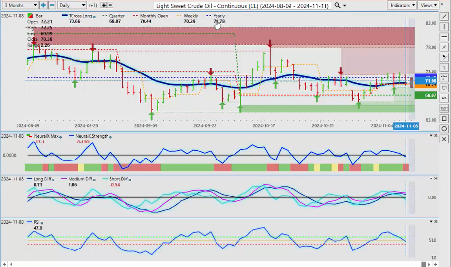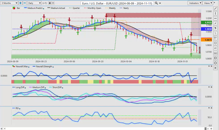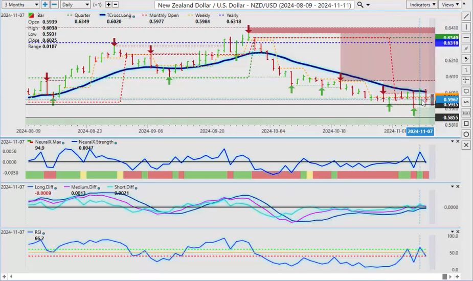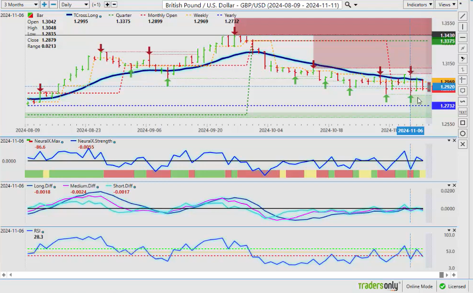 Now, as we move into some of our main FX pairs here, assuming Gold will rebound in the month of December, then we would likely see the Euro do the same thing. So right now, we do have another crossover to the downside, but remember, there’s your election bar, guys. That election bar on any market you’re trading, keep a very close eye on the lows and highs of that bar because I believe that there could be a false break here. But the low of that bar is coming in at 1.0683. Friday is a down day usually on the Euro anyway, but the Euro often follows Gold contract tracks. That’s your in-market correlation here, positive correlation. So if Gold, if and when Gold does rebound toward the end of the month, the Euro is likely to follow. So a little bit more downside, but be careful of a bear trap down here, okay? Because again, once we’re now we’re done with the election, they’ve priced in the dollar strength, they’ve priced in a lot of things here, guys. So I’m not saying the Euro can’t go lower. I’m saying we would need a sustained break of 1.0683 before we started getting aggressively short on this particular pair. So again, watch that MA diff cross, the pink line back up over the blue line for that contrarian long signal.