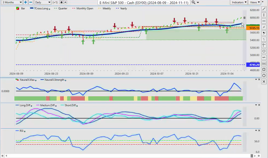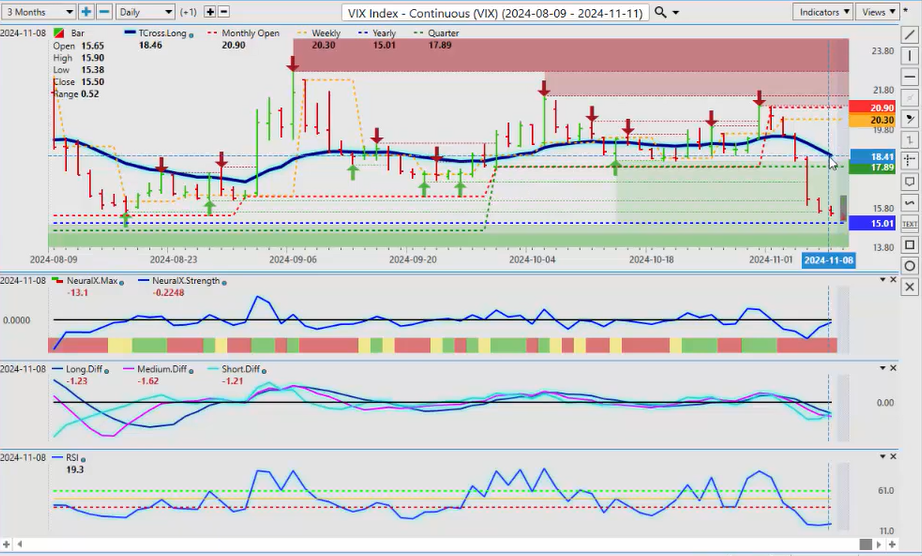 So, again, a significant break on this. Our T-cross long on that is now coming in at 18.46, but as I said in last week’s Outlook, I expected a big move in either the VIXs or the global equity markets as they again, I believe that they were hedging their bets, meaning buying both equity markets and buying the VIXs at the same time because they both don’t go up together, but they’ve been both holding firm for a fairly significant period leading up to this election. So, I do anticipate a breakdown of 15.01, but if we don’t get it, and again very important why we would never want to look at a rolling performance model, this blue line is the current calendar yearly opening price from January 1st, 2024. You can see that it has constantly been in play, the bulk of this calendar year. If I look back over a 9-month period, you can see it running all along this area, taking a big spike up, and its natural retracement point is back to that calendar yearly opening. If we start monkeying around with rolling performance using a random 5 days, a random 30 days, or 60 days, it distorts what the actual trend is.