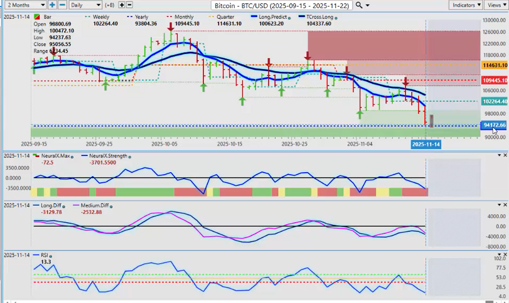 Now, with Bitcoin, Bitcoin falling hard also on Thursday and Friday, but you can see where it’s failing: 94,172. That is the critical level — the calendar yearly opening price. If we can hold above this level, Bitcoin remains bullish. But again, as I’ve mentioned many times in this outlook, Bitcoin follows a very regimented three-year cycle. Three years up, one year down. Three years up, one year down.