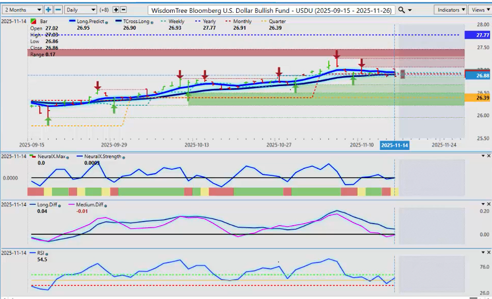 Now, it will be data-dependent. The government is now open. We will be starting to get some data. We’re going to have to get caught up on this, so it’s going to be choppy and volatile. But for now, the signal on the USDU is suggesting the dollar is weakening.