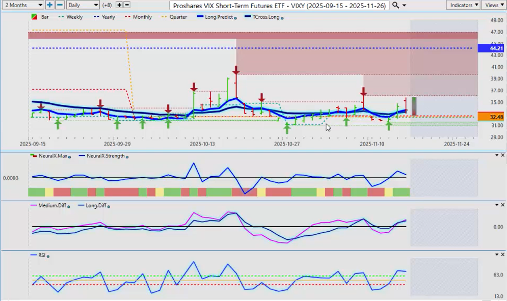 Now, tying all this together using the VIX, you can see that the VIX structurally is weak, but it is gaining a little bit of traction with the volatility around the Fed — the interest rate cuts. But again, for now, it’s starting to cross back up. But again, watch this very carefully on Monday, because there is a Monday–Tuesday reversal that occurs 80% of the time.