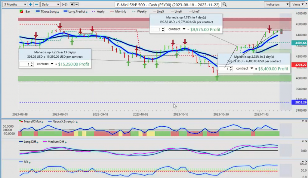 Now, when we look at the stock market and how it’s reacted to this dollar move lower, the first thing we need to do is identify we’ve had several decent rallies this month that started on basically October the 31st. We can see that during this rally, the S&P 500 has moved up approximately 4.87%. We’ve seen a similar rally this past week, up at 3%, but now we’re coming up into some verified resistance. That area of resistance high is approximately 4541. But the key thing we want to make sure that we’re understanding here is when this stock market has rallied on both of these occasions, and I’ll use the example here of October the 31st to approximately November the 3rd, and you can see the secondary rally has occurred this past week. But we’re also starting to stall out a little bit up here. The Vantage Point indicators are actually quite mixed here. They’re suggesting that this rally is not as strong as what it appears to be.